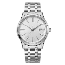 Modern silver watch with stainless steel bracelet and black dial. Professional and sleek.